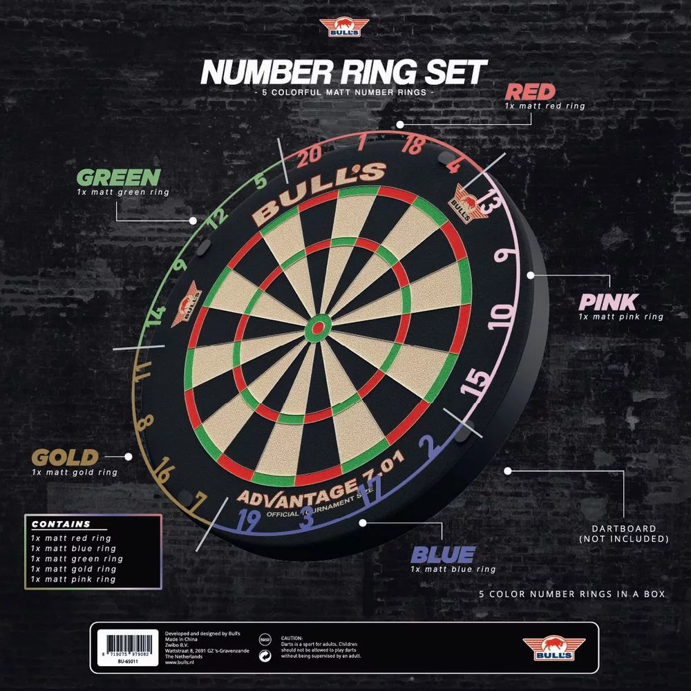 Dodajte svojmu sisalovému terču nový vizuálny štýl so sadou piatich matných číselníkov Bull’s v žiarivých farbách: červená, zelená, ružová, oranžová a matná zlatá. Ideálny spôsob, ako vyladiť vzhľad terča podľa interiéru, farby ochrannej steny alebo jednoducho podľa nálady!