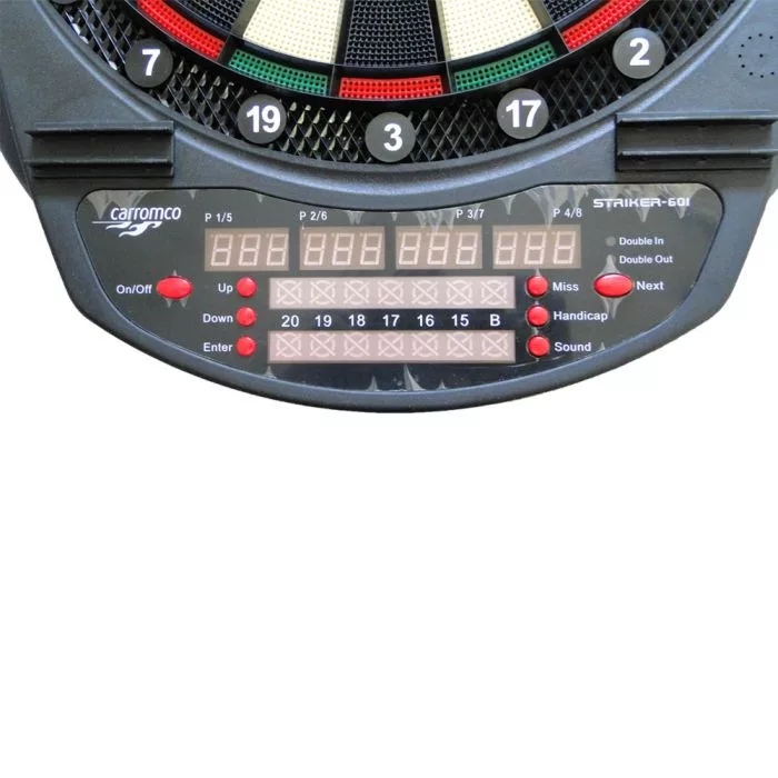 Carromco STRIKER 601 je elektronický terč na domáce použitie, ktorý prináša zábavu pre celú rodinu aj priateľov. Až pre 8 hráčov, so 6 LED displejmi, nastaviteľnými zvukovými efektmi a praktickými funkciami ako