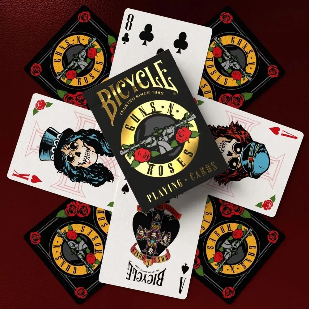 Zaži atmosféru „Paradise City“ pri každej hre! Limitovaná edícia Bicycle Guns N’ Roses prináša ikonický dizajn z albumu Appetite for Destruction priamo na vaše hracie karty. Elegantná krabička so zlatou fóliou dodá tvojej zbierke alebo partii nádych exkluzivity.