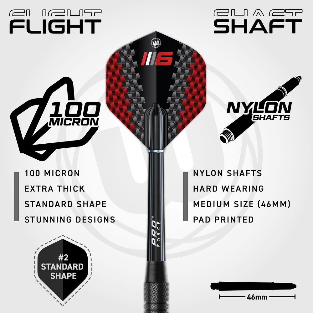 Dve sady šípok vyrobené z 80 % wolfrámu s ring grip drážkovaním pre lepší úchop. Nylonové násadky a 100 mikrónové letky štandardného tvaru zaručujú odolnosť a stabilný let.