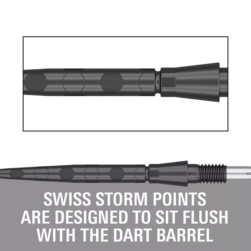 Hroty Storm Onyx s jedinečným dizajnom vytvoreným pomocou bodového lasera poskytujú extra priľnavosť prstom a pomáhajú šípkam bezpečne sa zapichnúť do terča. Vyrobené sú z prvotriednej nehrdzavejúcej ocele a ďalej sú zušľachtené procesom vákuového kalenia. Tieto hroty ponúkajú zvýšenú odolnosť a zníženie odchýlky letu šípok.
