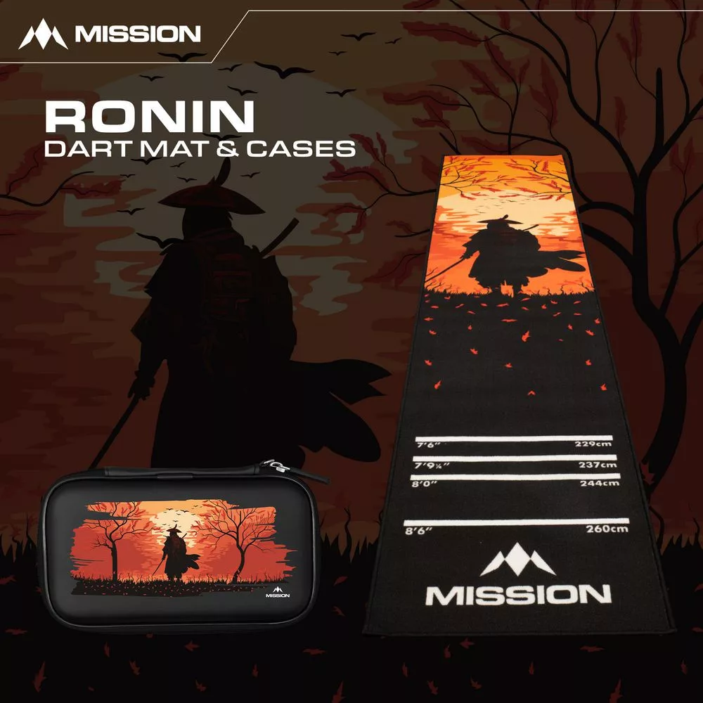 Koberec Mission Ronin je ľahký nešmykľavý a dokonale dopĺňa rodinu produktov Mission Ronin. Táto podložka na šípky s pútavým samurajským dizajnom a logom Mission má vyznačené oficiálne turnajové vzdialenosti pre steel šípky a soft šípky. Ľahká konštrukcia koberca znamená, že ho je možno ľahko rozvinúť, prepraviť a uskladniť a je skvelým doplnkom pre akúkoľvek hru.