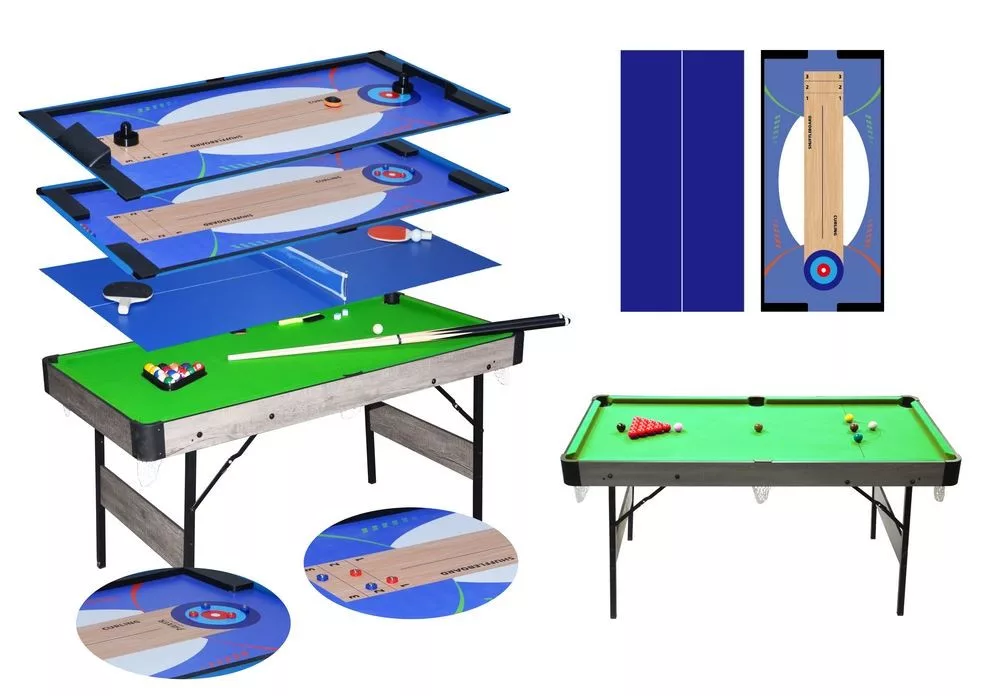 - Typ: multifunkčný stôl 6 v 1 (biliard, snooker, vzdušný hokej, ping pong, curling, shuffleboard)