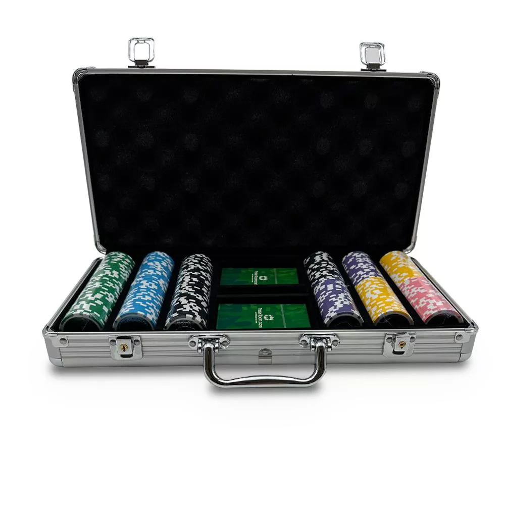 Kvalitný klasický pokrový 300 kusový set v hliníkovom kufríku. Očíslované žetóny vážia 11,5 gramov a majú kovové jadro.