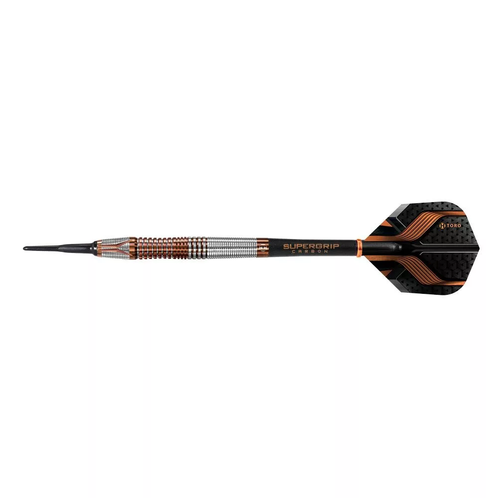 Šípky Toro sú dodávané spolu s midi násadkami Black Supergrip Carbon a novými 100 mikrónovými letkami Toro a čiernymi plastovými hrotmi.