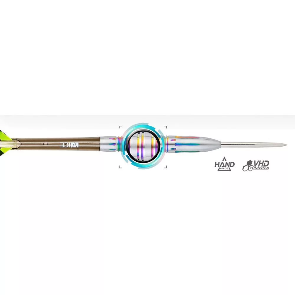 Šípky One80 Chameleon VHD sú vyrábané v rôznych tvaroch a pokryté veľmi krásnym dúhovým efektom. Uchopenie šípok je veľmi pohodlné a šípky sú veľmi dobre vyvážený na stred. Vyrobené sú z vysoko kvalitného 90% VHD volfrámu a veľmi precízne ručne opacované!