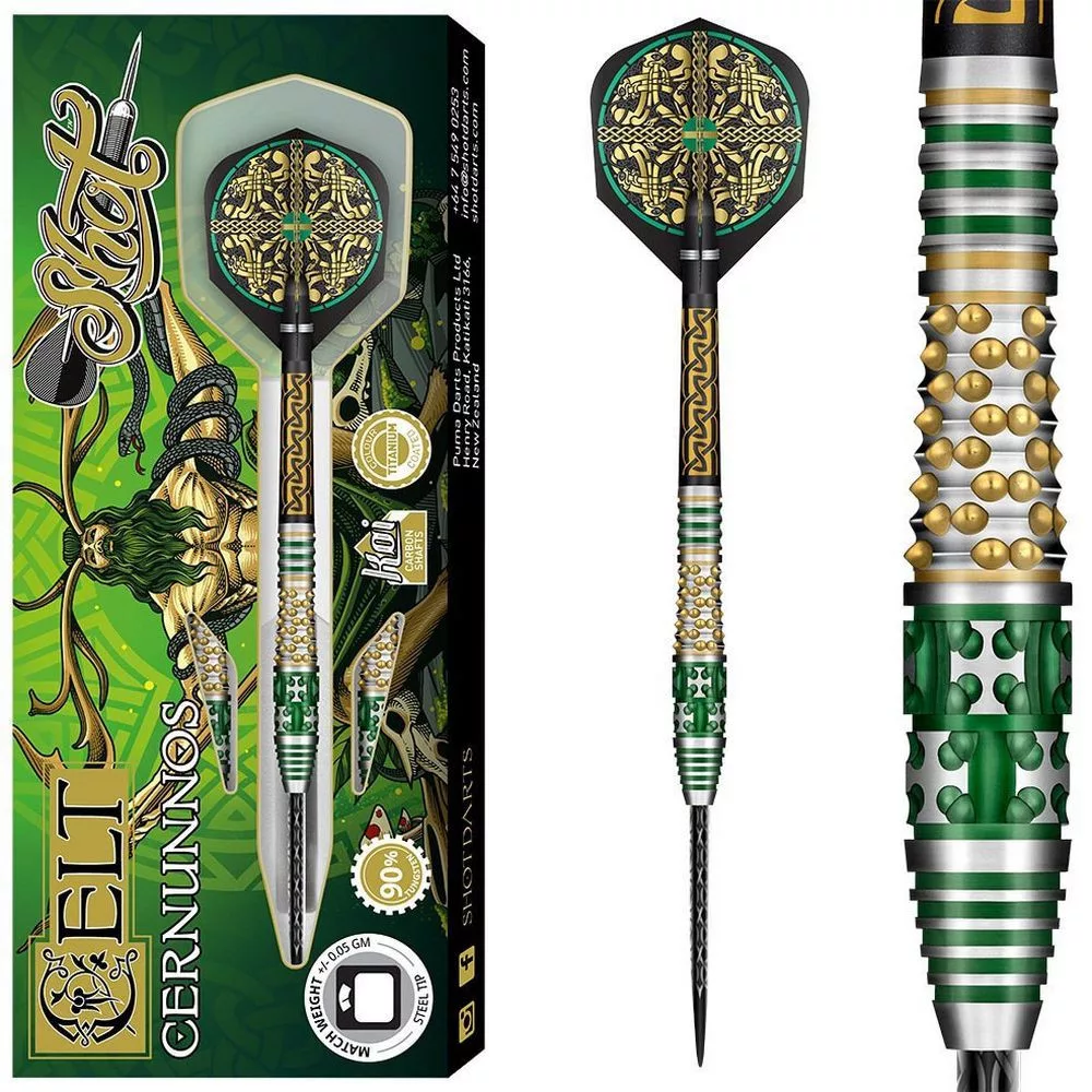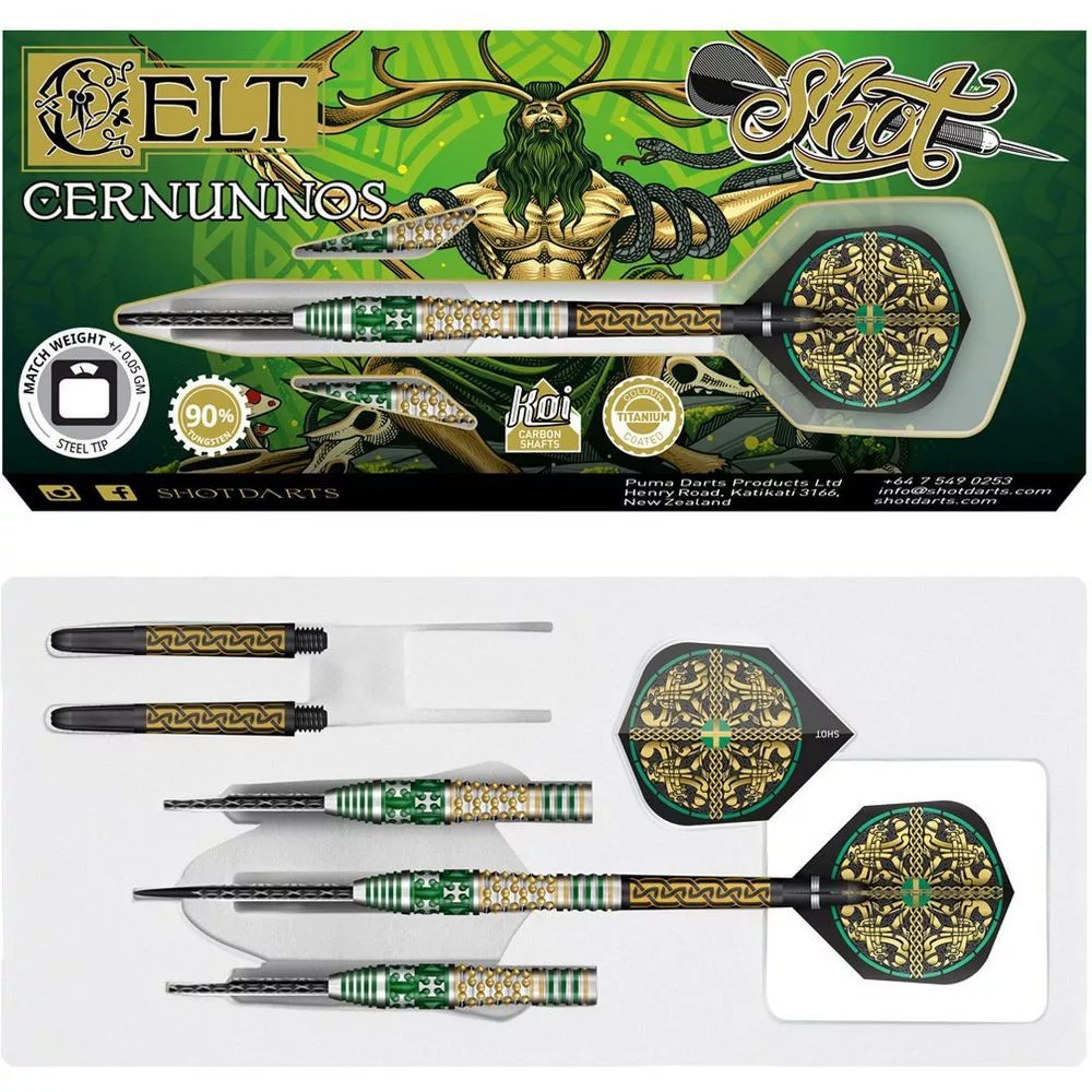 Oháňaj sa kopijou a chváľ svoje parohy. Sada šípok Cernunnos zachytáva múdrosť tohto strážcu lesa a mystického keltského boha zvierat a divokej krajiny zahalenej hmlou. So svojou zložitou textúrou, keltskými krížmi a čeľusťami z briaru vyrezávanými ako kôra mohutných dubov a potiahnutými zelenou a zlatou farbou vám tieto šípky z 90% volfrámu pomôžu vidieť stromy v lese.