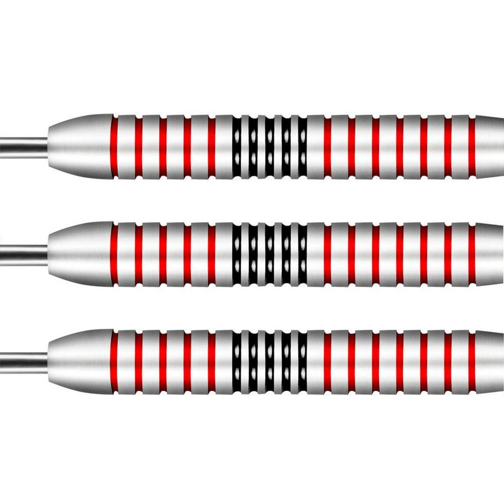 Telíčka z mosadze so strieborným povrchom a červeno-čiernymi akcentmi sú navrhnuté pre stabilný let a istý úchop. Hmotnosť 24 gramov a šírka 8,6 mm ponúkajú vyvážený pocit pri hode. Súčasťou balenia sú čierne nylonové násadky Inbetween, letky Bully Boy No6 a štandardné kovové hroty.