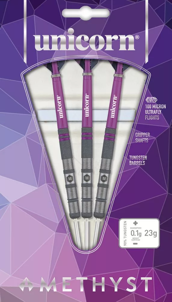 Predajné balenie obsahuje 3 kusy kompletných steel šípok Unicorn Amethyst 1 23g, 90% wolfram.