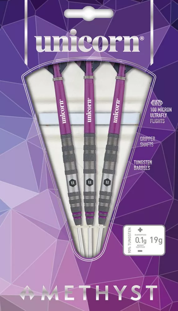 Predajné balenie obsahuje 3 kusy kompletných steel šípok Unicorn Amethyst 2 21g, 90% wolfram.