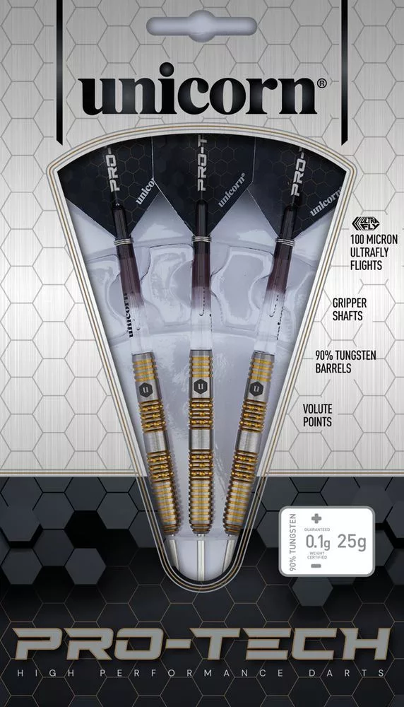 Sada Pro-Tech je odvodená z niektorých z najlepších telíčok šípok používaných hráčmi Unicorn, ale prepracovaná vďaka pridaniu zložitého opracovania a úžasnej povrchovej úprave.