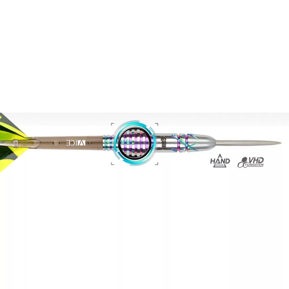 Hrubý profil, homogénne telíčko s hustými drážkami a povrchom s pixelmi. Táto kombinácia, ktorá je jedným z hlavných rysov, ponúka lepší pocit priľnavosti a isté uchopenie šípok. Jedinečný dizajn farbu meniacich povrchov, inšpirovaný chameleónom, dopĺňa vynikajúci výkon týchto šípok.