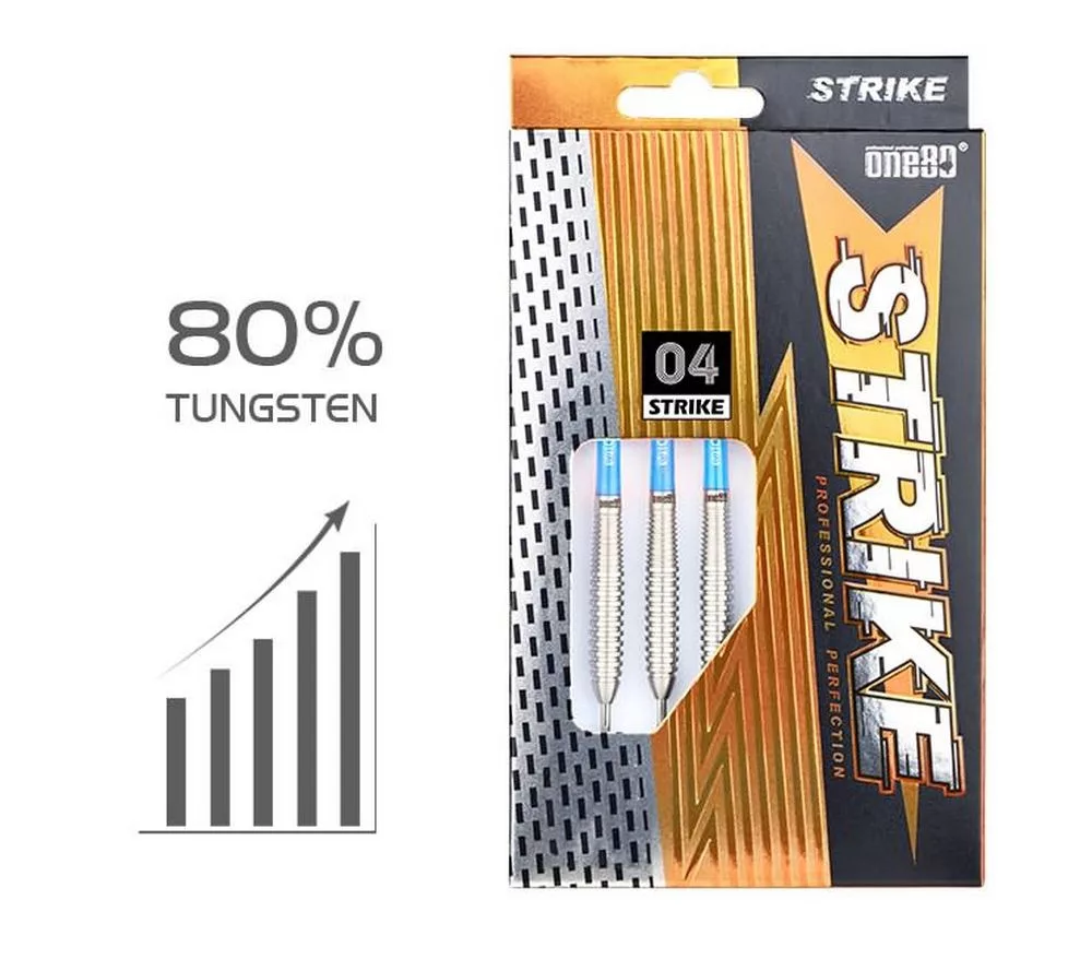 Strike 04 zo série ONE80 je ideálny pre hráčov, ktorí hľadajú robustnejšie telo s vyšším priemerom a dobrým gripom. S hmotnosťou 24 g a telom z 80 % wolfrámu ponúkajú tieto šípky výbornú odolnosť a vyvážené letové vlastnosti.
