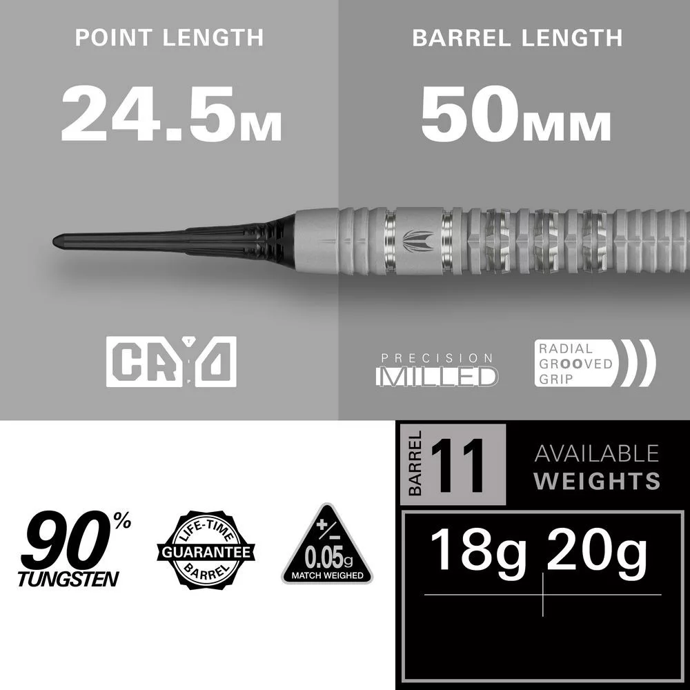 Target Cryo 11 Soft Tip sú špičkové šípky navrhnuté pre technicky zdatných hráčov, ktorí hľadajú kontrolu, presnosť a konzistentný štýl hry. Vyznačujú sa moderným telom z 90 % wolfrámu, precízne frézovaným gripom a novou generáciou Cryo soft tip hrotov, ktoré výrazne znižujú počet odskokov.