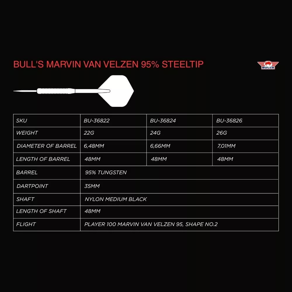 Model Bull's Marvin van Velzen 24 g vznikol v spolupráci s holandským profesionálnym hráčom. Vďaka 95 % wolfrámu, prepracovanému gripu a elegantnému čierno-zlatému dizajnu sú tieto šípky ideálne pre náročných hráčov, ktorí vyžadujú presnosť a štýl.