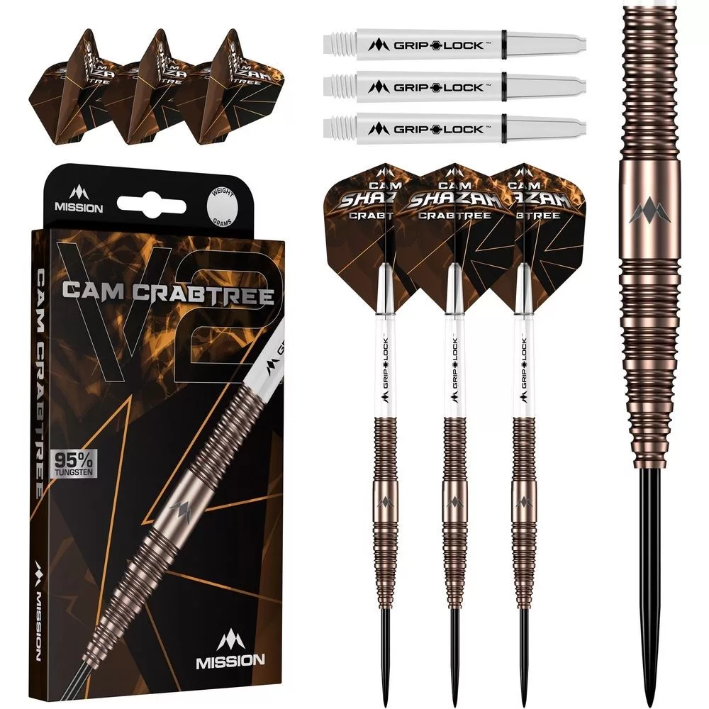 Mission Cam Crabtree V2 sú druhé signature steel šípky hráča Cama Crabtreeho, známeho pod prezývkou „Shazam“. Set je navrhnutý pre hráčov, ktorí chcú prémiový materiál, istý úchop a konzistentné správanie pri hode. Vďaka