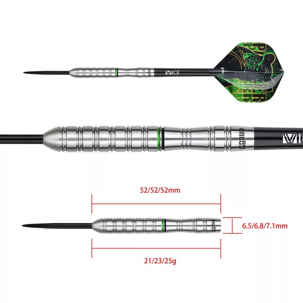 Sú vybavené násadkami Vice Proplast pre optimálny let a letkami One80 s hrúbkou 100 mikrónov pre aerodynamickú stabilitu a kontrolu. Čierne oceľové hroty normálnej dĺžky zabezpečujú spoľahlivé zapichnutie do terča.