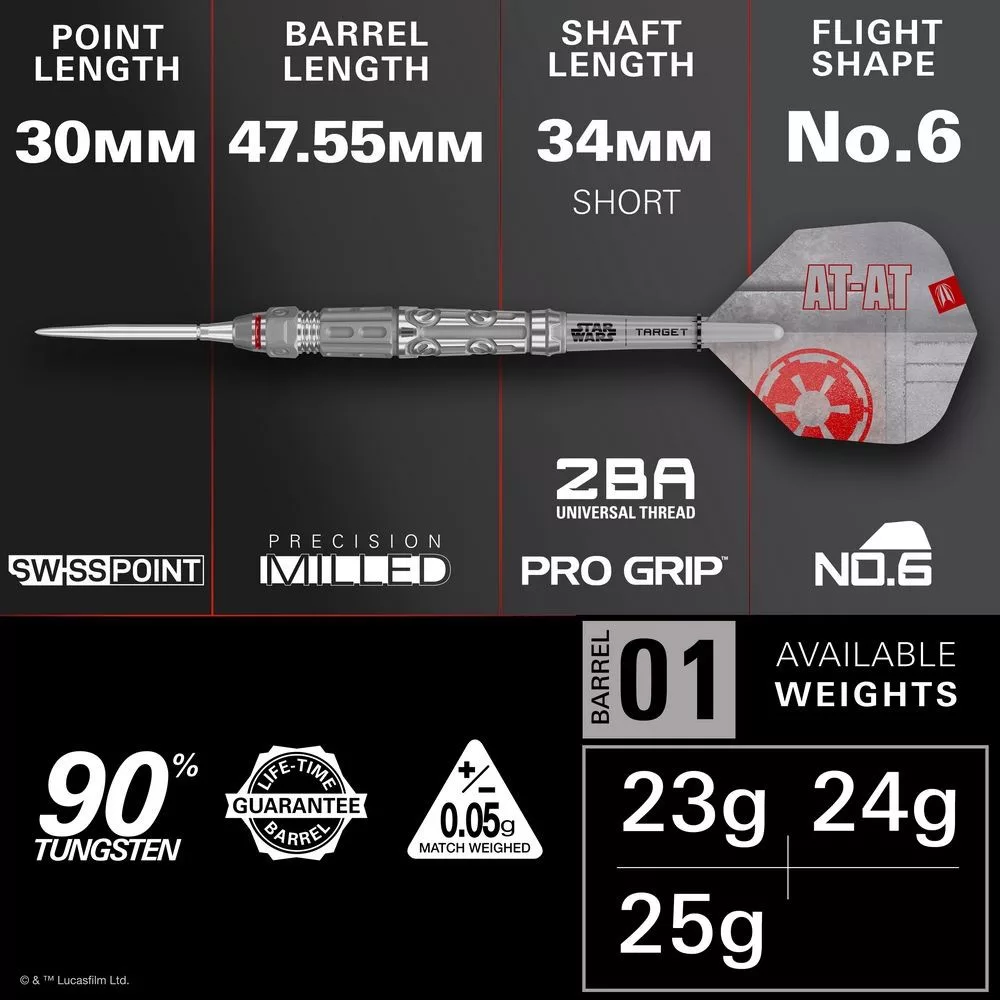 Set dopĺňajú odolné Pro Grip násadky zo špeciálneho polyméru a Pro Ultra letky No.6 s grafikou AT-AT. Spoločne zabezpečujú stabilný let a spoľahlivý výkon pri každom hode.