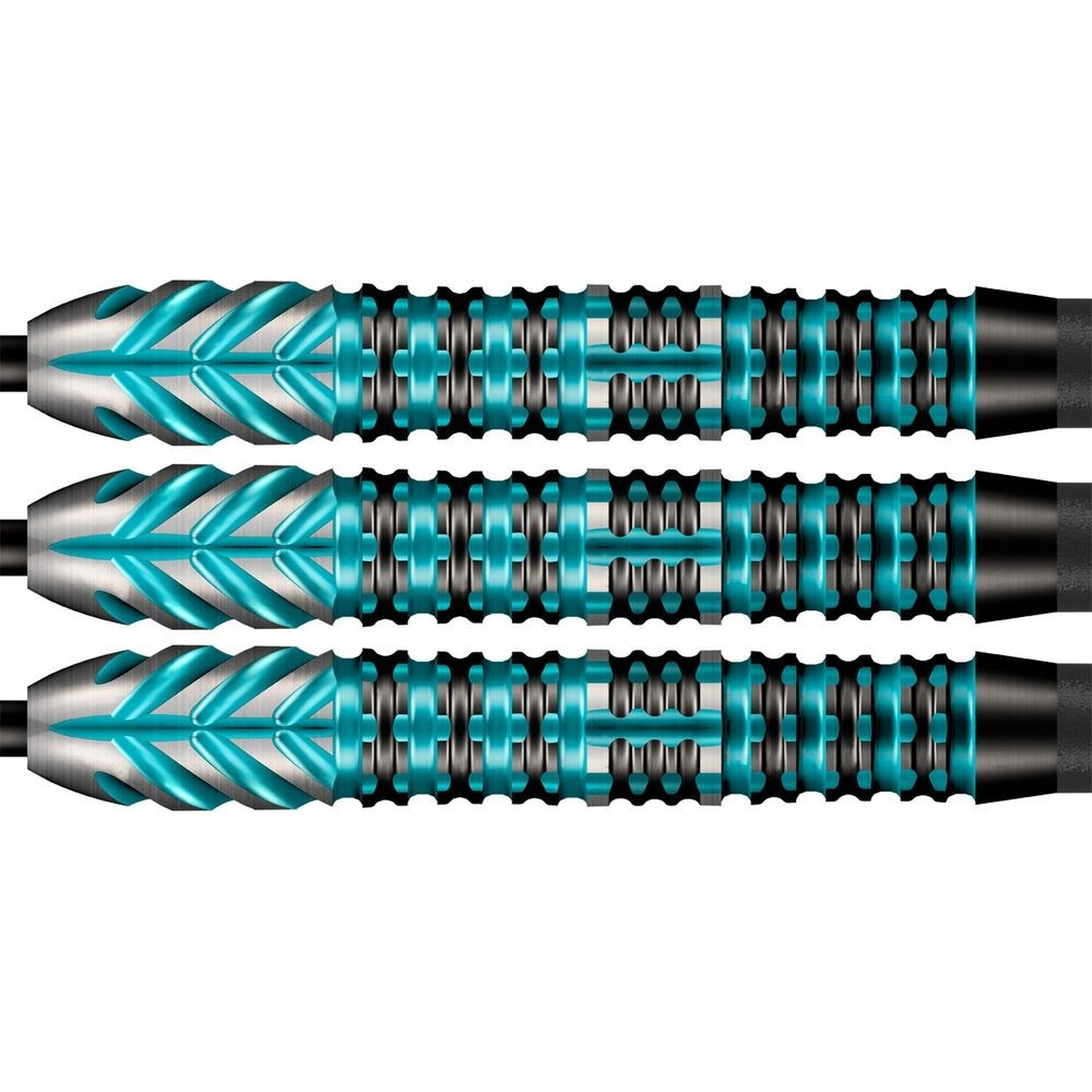 Telo z 90 % wolframu poskytuje vysokú hustotu, štíhly profil a dlhú životnosť. Povrch Black Titanium s tyrkysovými detailmi dodáva šípkam moderný a dynamický vzhľad.
