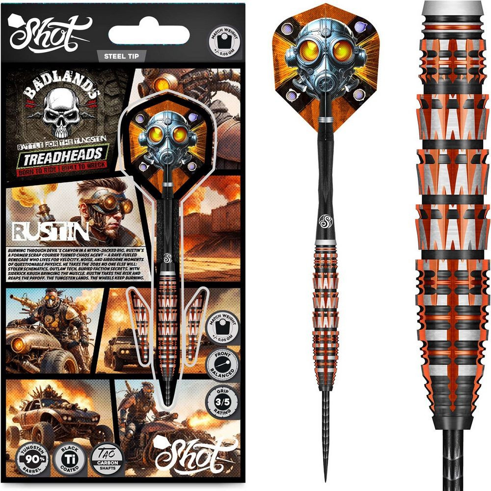 Shot Badlands Rustin steel 24g sú stvorené pre hráčov, ktorí sa neboja riskovať a chcú hrať s maximom energie. Objav nový rozmer šípkarskej hry s Rustinom – šípkami, ktoré nezaprú svoj renegátsky charakter!