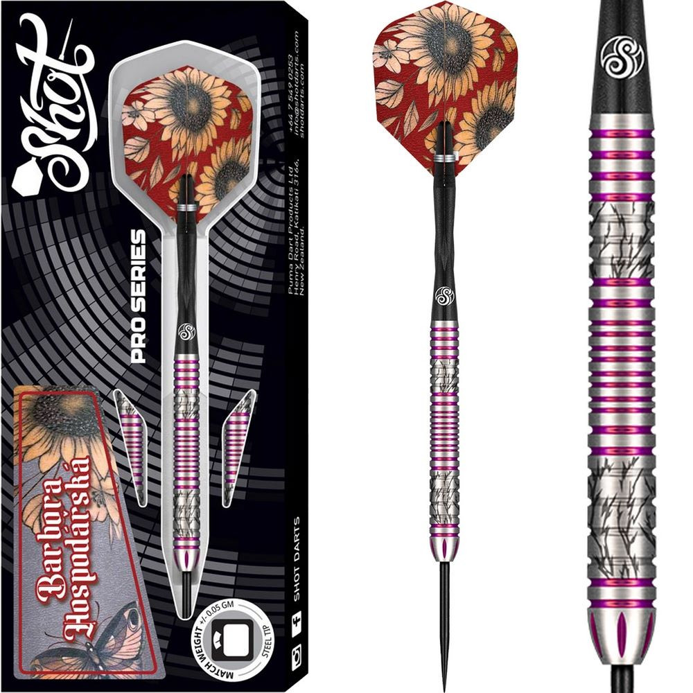 Shot Barbora Hospodářská 2.0 sú profesionálne oceľové šípky navrhnuté pre moderné hráčky, ktoré uprednostňujú precíznosť, kontrolu a štýl. Nový model zo série Pro Series sa vyznačuje štíhlym, rovným telom so subtílnym predným zúžením, vďaka čomu poskytuje plynulý, rýchly a vyvážený pocit pri každom hode.