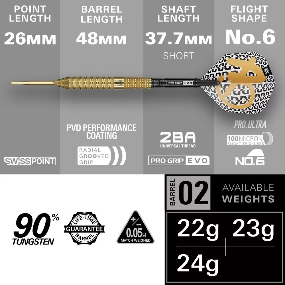 02 má rovnú strednú časť s kužeľovým zakončením vpredu aj vzadu. Tento dizajn umožňuje flexibilné držanie a je vhodný pre predný, stredný aj zadný úchop. Vďaka tomu ide o ideálnu voľbu pre hráčov, ktorí chcú univerzálne šípky prispôsobiteľné rôznym situáciám.