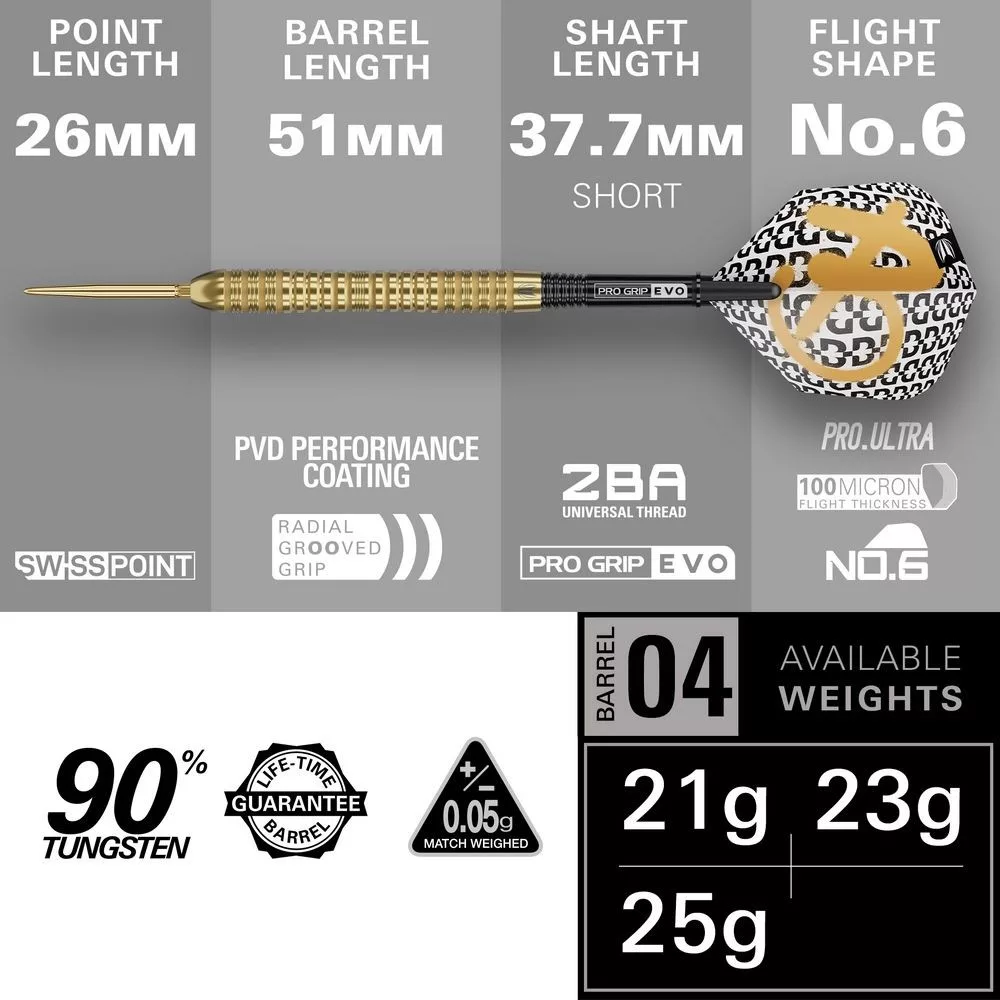 scallop tvaru, presného vedenia úchopu a moderných technológií. Vďaka 90 % wolfrámu, radiálnemu gripu a Swiss Point systému získate šípky, ktoré sú pripravené na presnú, rýchlu a konzistentnú hru.