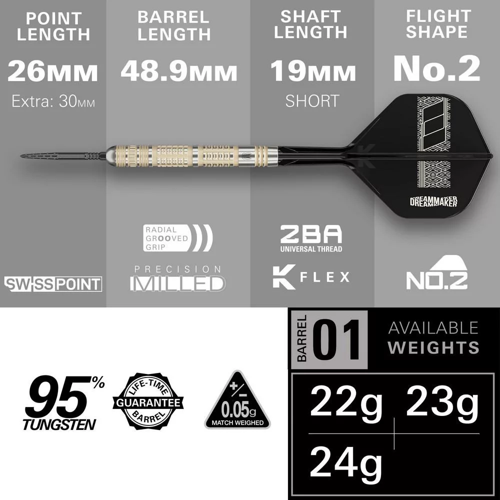 - Prémiový 95% wolfrámový barrel: Rovný profil a viaczónový grip (radiálne drážky + precízne štvorcové frézovanie) zaručujú výnimočnú kontrolu a konzistentné držanie.