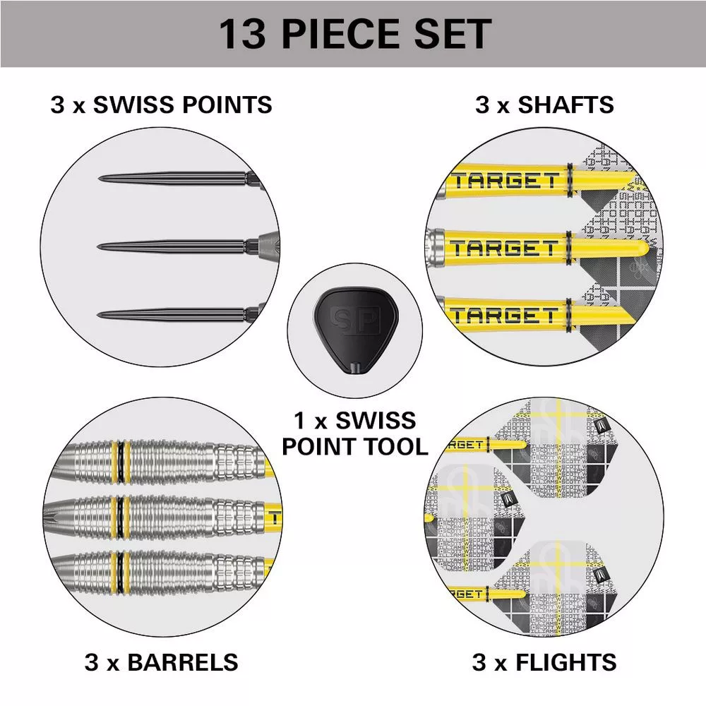 - Hroty: Swiss Point Smooth 26 mm – hladké strieborné hroty pre komfortný úchop a plynulé zapichnutie do terča