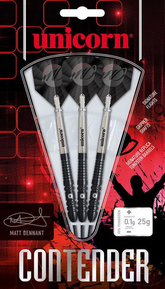 Unicorn Matt Dennant 25g, šípkami z prestížnej série Unicorn Contenders. Tieto šípky sú navrhnuté pre tých, ktorí chcú súťažiť na najvyššej úrovni a dominovať nad zavedenými šampiónmi. Matt Dennant dôveruje týmto šípkam, aby mu pomohli dosiahnuť svetové tituly, a teraz môžu byť aj tvojou tajnou zbraňou.