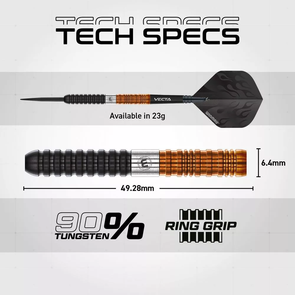 Unikátny trojdielny ring grip (čierny, strieborný stred, medený) zaručuje pevný a istý úchop po celej dĺžke šípky, čo ocenia hráči všetkých štýlov. Vďaka plnému gripu s hodnotením úrovne 4/5 získate spoľahlivý pocit a konzistentné uvoľnenie aj v tých najnapätejších momentoch zápasu.