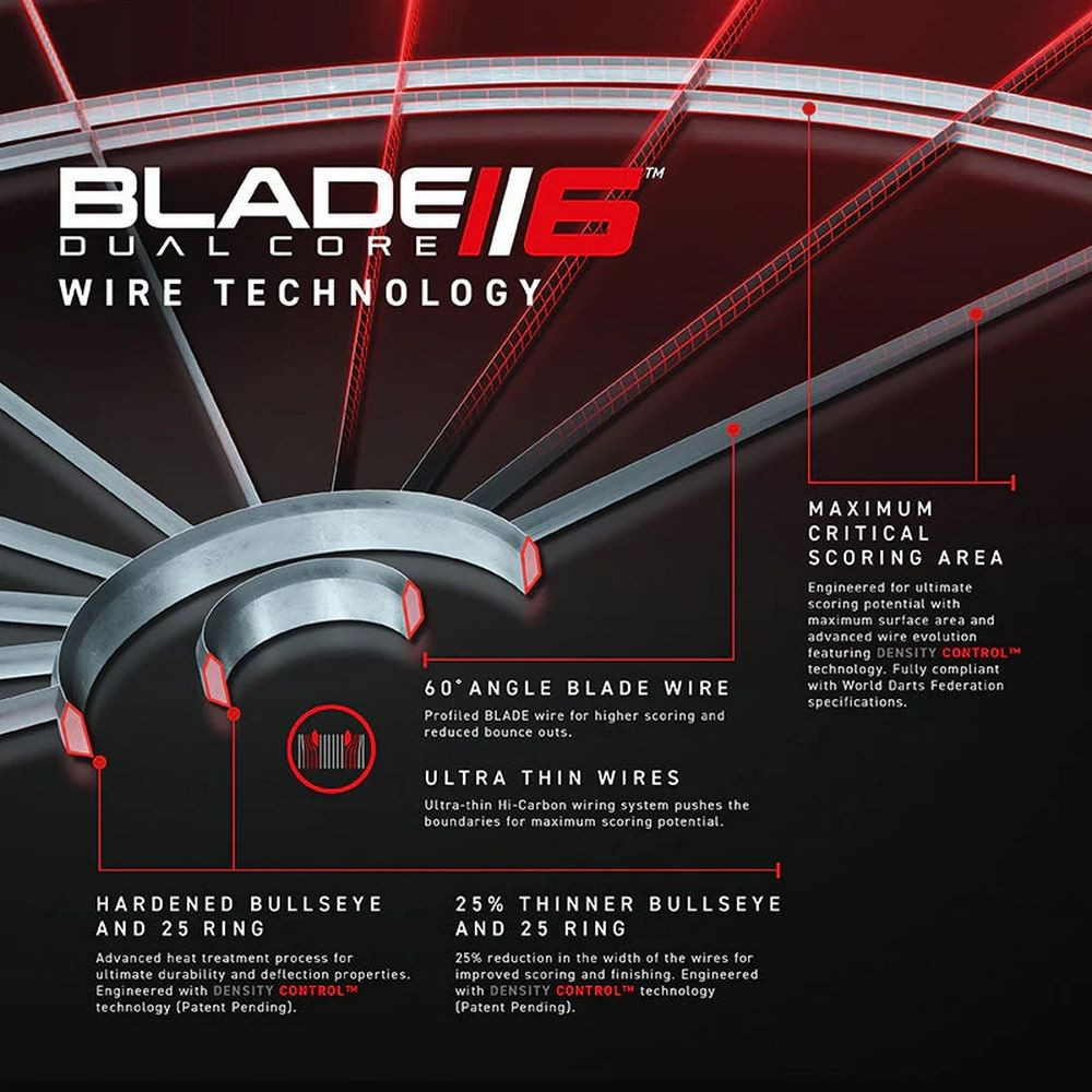 Blade 6 Dual Core je navrhnutý pre tých, ktorí vyžadujú dokonalosť. Dvojitá hustota sisalu umožňuje hladké prenikanie šípok do vonkajších častí a zároveň absorbuje kinetickú energiu v jadre, čím chráni vlákna pred opotrebovaním. Ultra tenký drôt skosený pod 60° uhlom nasmeruje šípky priamo do cieľa a minimalizuje odrazy. Nový systém