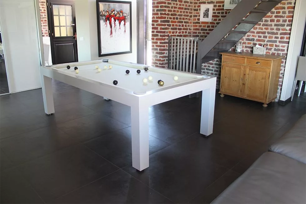 Biliardový stôl Toulet Pearl sa dá ľahko zmeniť na jedálenský alebo konferenčný stôl.