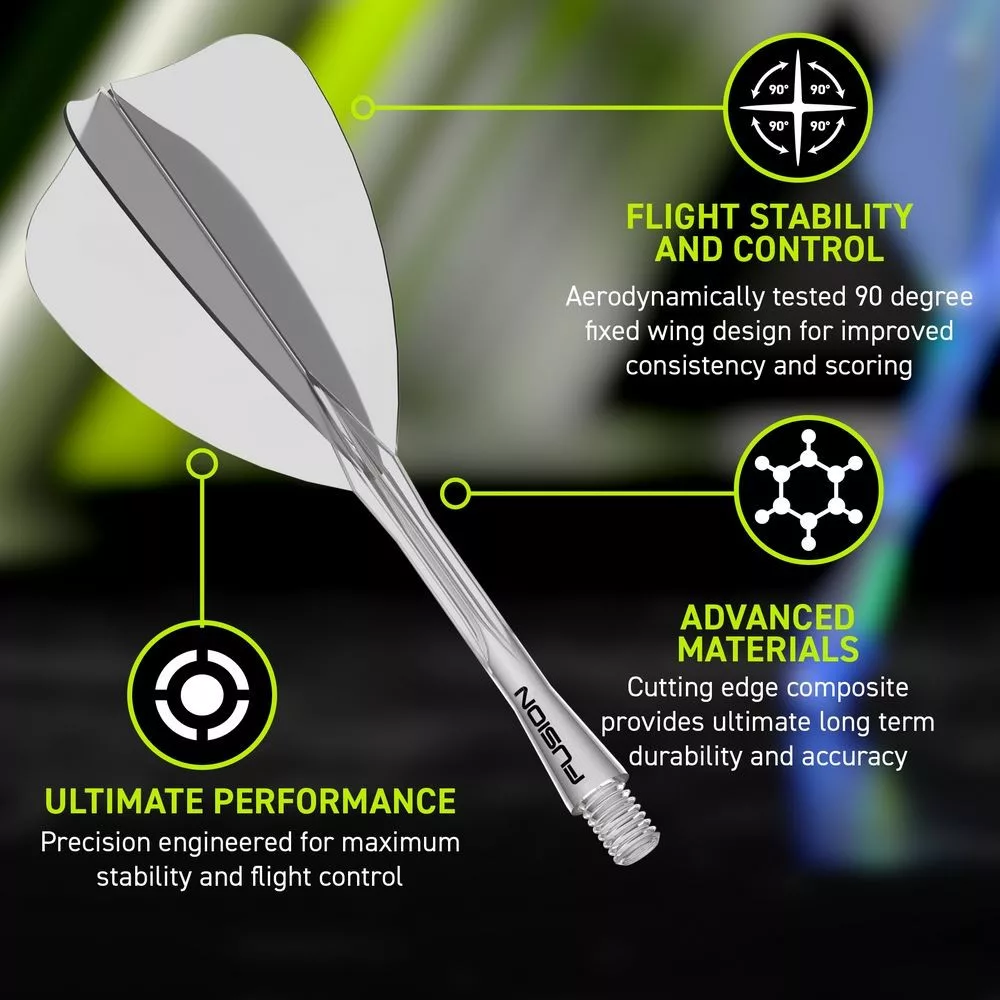 Winmau Fusion Arrow! Tento inovatívny, integrovaný systém letky a násadky ponúka výnimočný aerodynamický výkon a maximálnu odolnosť. Vďaka precíznemu 90° profilu krídel, testovanému pre dokonalú stabilitu letu, získate rovnomerný, kontrolovaný hod bez bilancovania alebo vypadnutia letky. Číry priehľadný dizajn dodá moderný športový štýl a poskytuje jasnú viditeľnosť šípky počas hry.