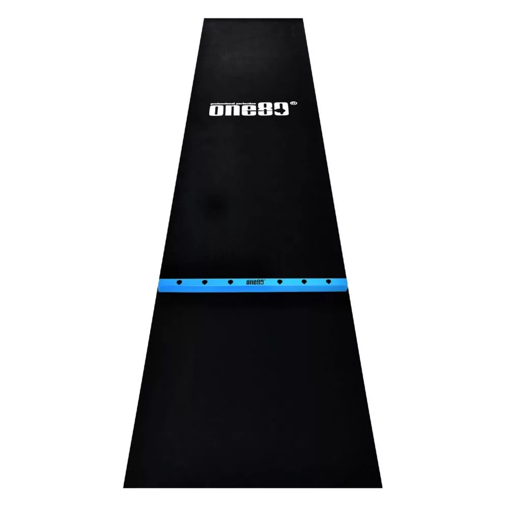 gumový koberec ONE80 s modrou hranicou hodu (oche) a bielym logom One80 je navrhnutý na ochranu podlahy a šípok pri každej hre. Vhodný na domáce aj turnajové využitie, s protišmykovým povrchom a integrovanou oche líniou pre presné postavenie hráča.