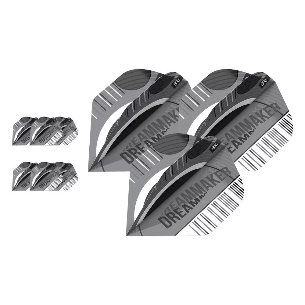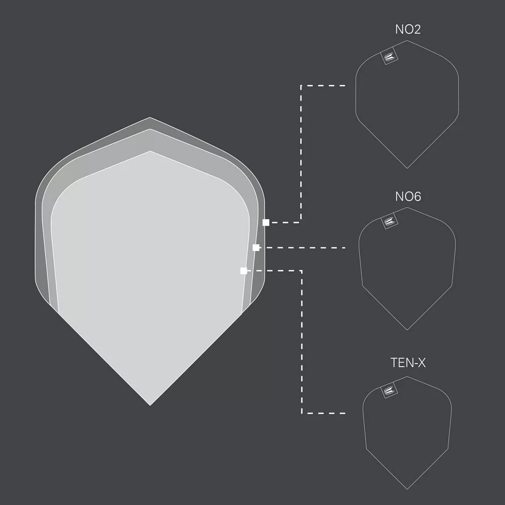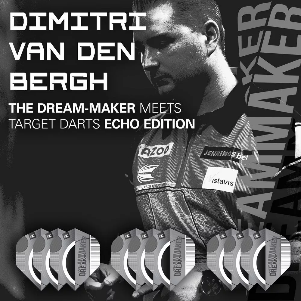 Sivé letky Dimitri Van Den Bergh 90% x Echo boli navrhnuté pre jeho novú sériu šípok a navzájom sa dopĺňajú. Vyrobené sú pomocou bodovej UV potlače, ktorá zlepšuje ich priľnavosť k násadkám.