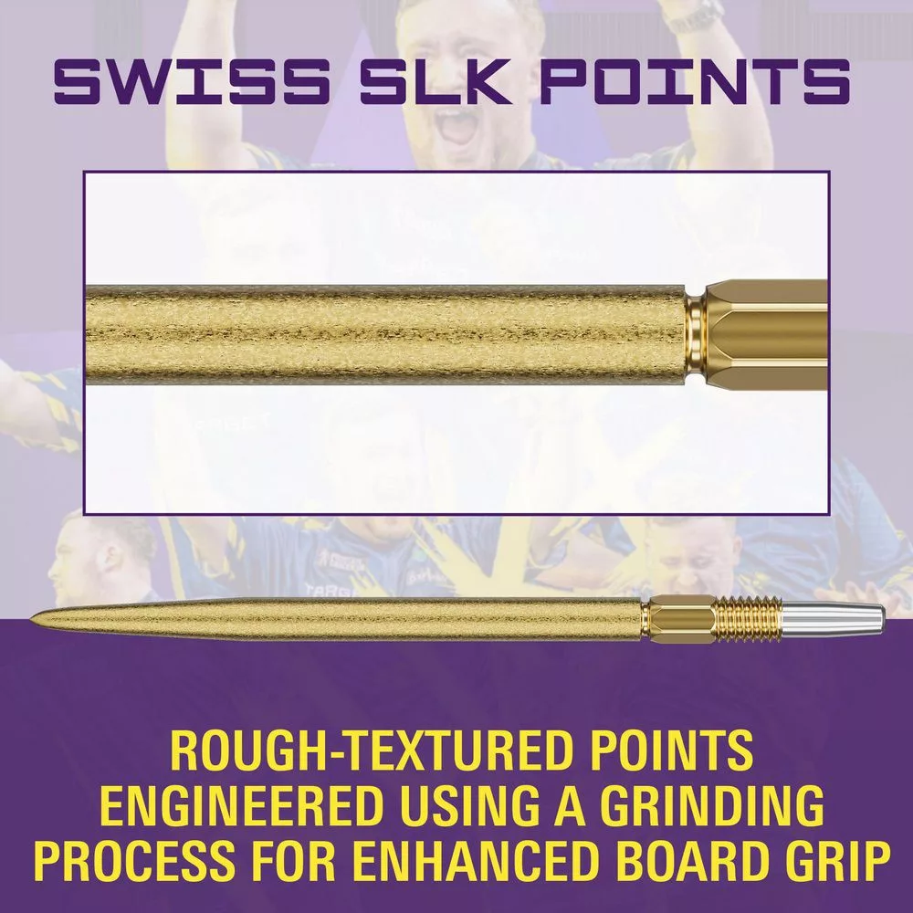 Zlaté Swiss SLK hroty od Target sú navrhnuté pre hráčov, ktorí to myslia vážne. Ideálne pre presnú hru a expresnú výmenu vďaka Swiss Point technológii – s kľúčom, ktorý sa zmestí aj do vrecka.